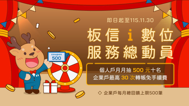 1.個人戶:「網銀新戶」於活動期間內申辦個人網路銀行並於當月完成任一筆帳務扣帳交易者,可參加每月抽獎活動,每月抽出7-11商品🎁禮券500元十名,活動期間共計抽出八十名。