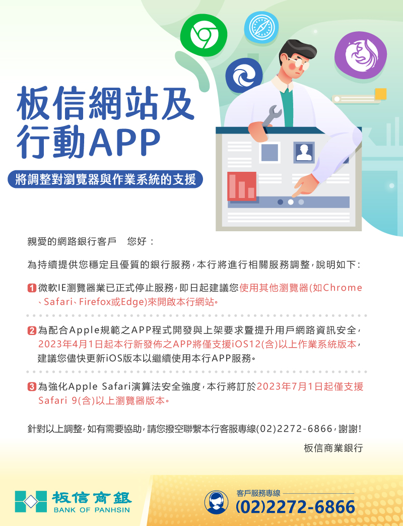 本行網站及行動APP將調整對瀏覽器與作業系統的支援